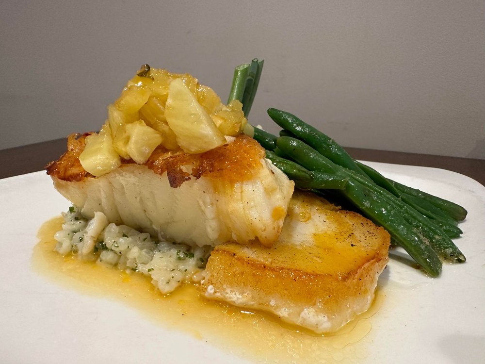 Citrus beurre Blanc, seasonal risotto, green beans.